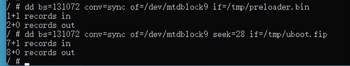 - dd bs=131072 conv=sync of=/dev/mtdblock9 seek=28 if=/tmp/uboot.fip