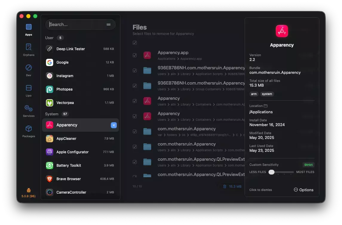 - 干净卸载选项: 可以彻底移除Pearcleaner及其相关文件和启动项。