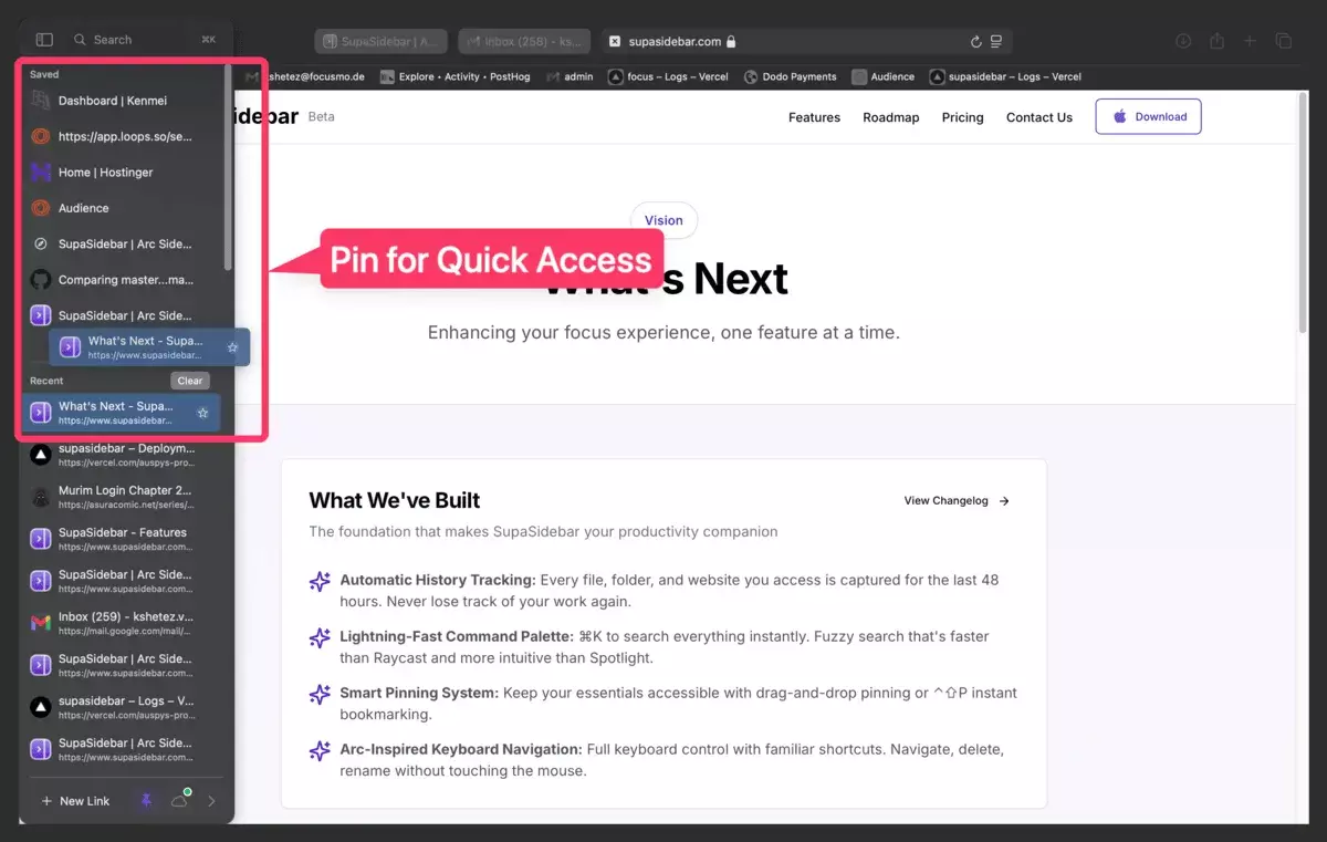SupaSidebar是一款为Mac设计的菜单栏应用,提供类似Arc浏览器的侧边栏体验,可以轻松保存链接、文件和文件夹,让用户只需轻点即可访问。此应用支持全局键盘快捷键,帮助用户高效使用不同浏览器,自动跟踪最近访问的网站,方便管理繁多的标签页。SupaSidebar可自定义,用户可以轻松固定常用项目,并通过快速搜索功能即时找到文件、文件夹或应用。其界面友好,无需复杂配置,并兼容Safari、Chrome、Firefox等主流浏览器。用户反馈显示,SupaSidebar能显著提升工作效率,尤其适合需要在多个浏览器中频繁切换的用户。该应用提供7天免费试用和透明定价,旨在让用户在无广告和隐藏费用的环境下享受高效的工作体验。SupaSidebar的持续更新和用户反馈融入,使其成为许多Mac用户日常工作中的“必须安装”应用。