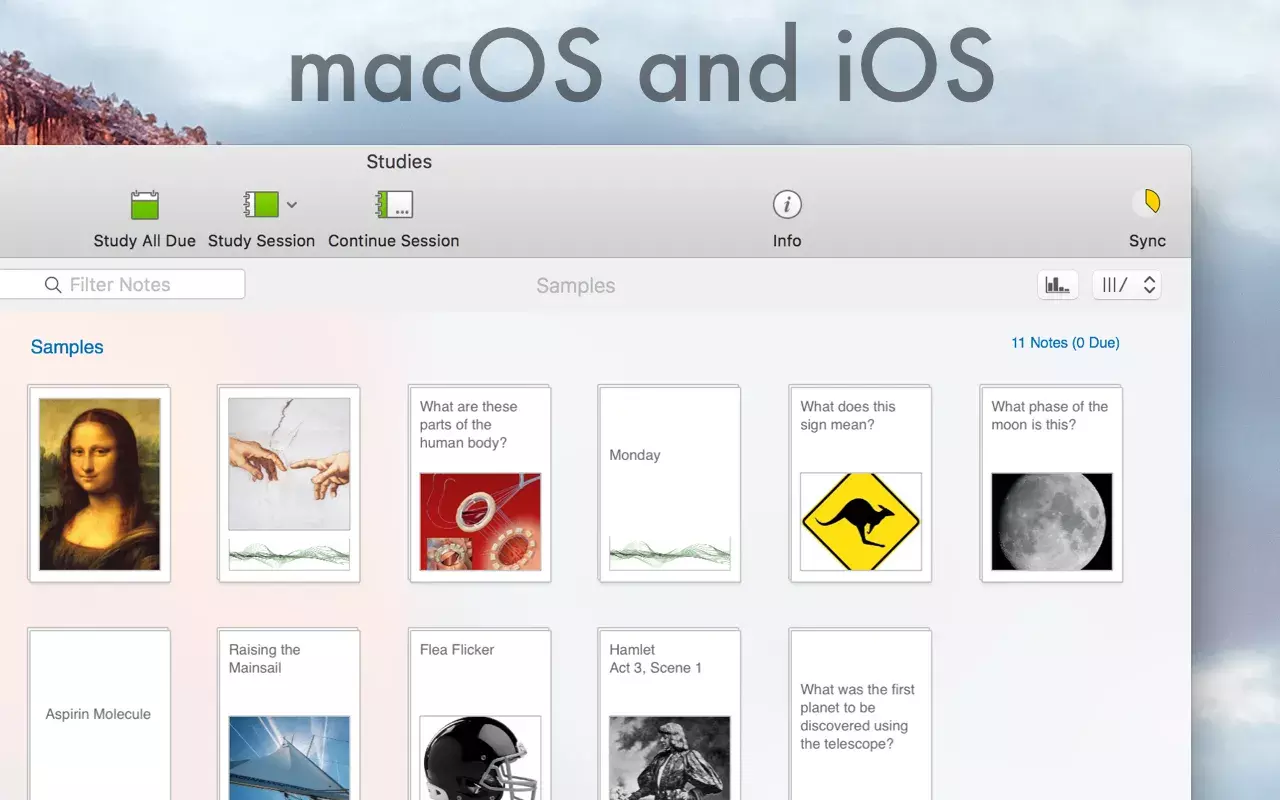 - Studies应用适用于Mac、iPhone和iPad,并且通过iCloud美妙地同步。在课堂上使用Mac上的Studies开始学习,在回家的公交车上用iPhone继续学习,在沙发上用iPad完成学习。