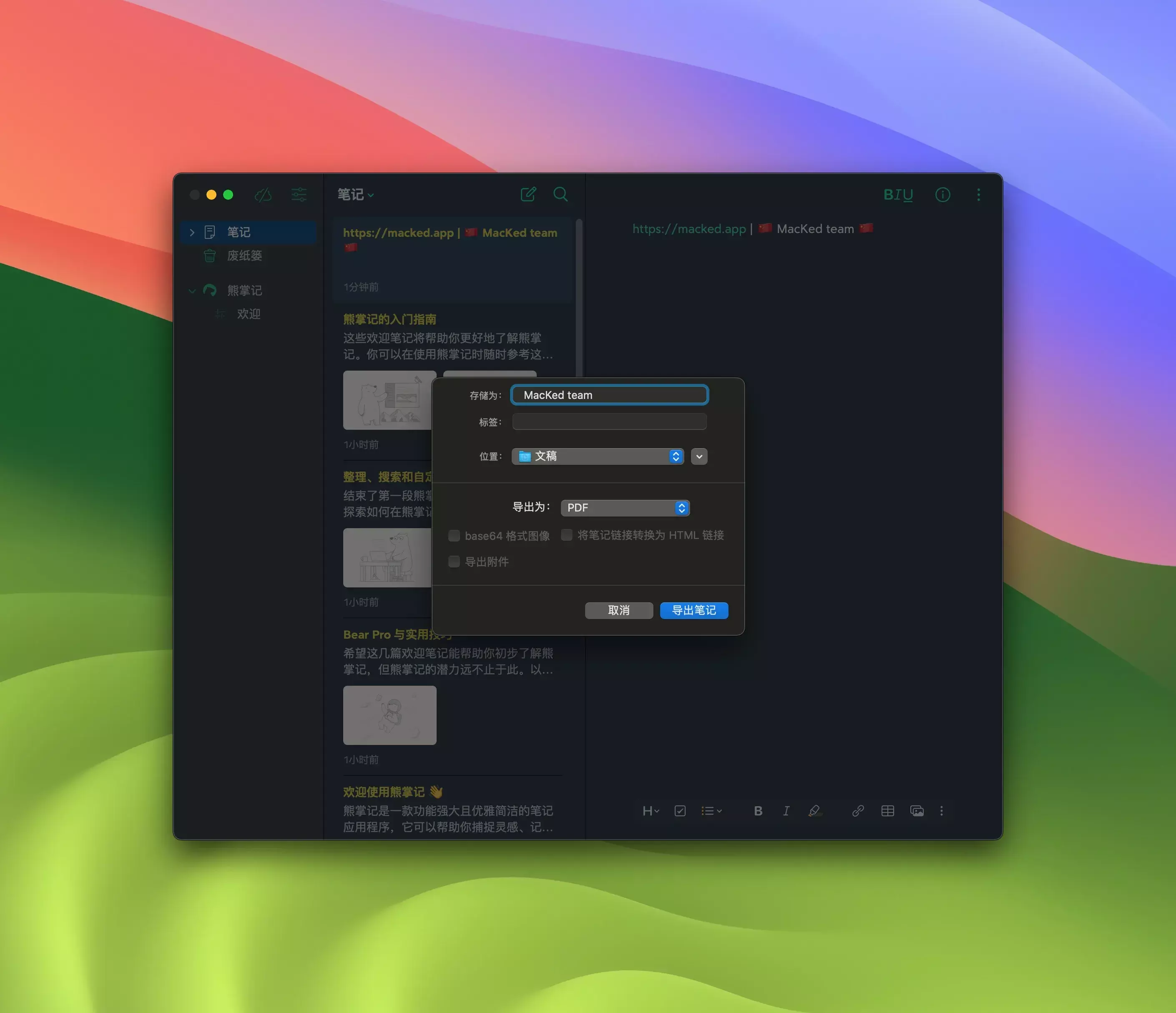 - 将笔记导出为纯文本、Markdown、TextBundle、熊掌记笔记和富文本格式