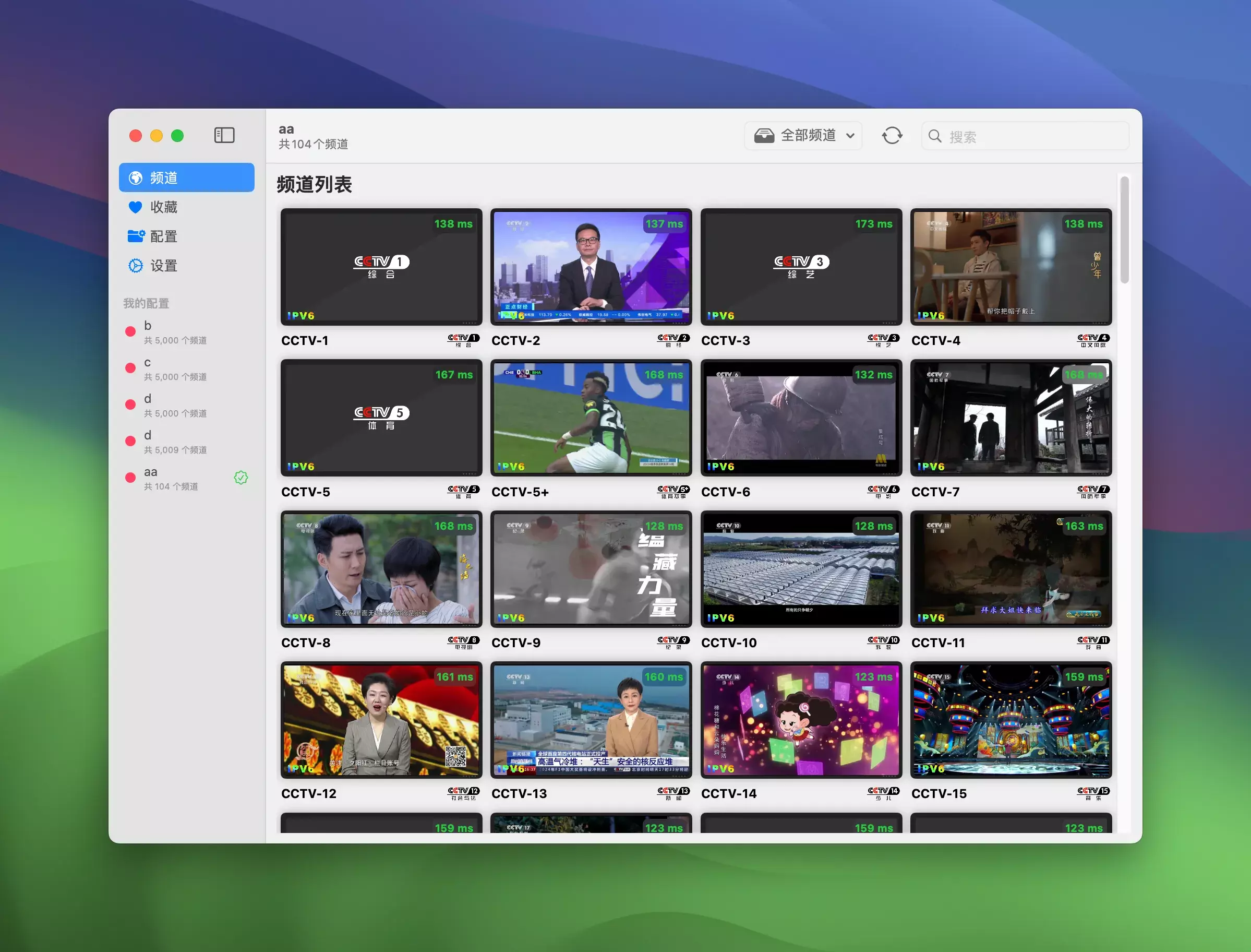 - 实时预览功能: 用户可以实时预览直播源当前播放的内容,极大提升观看体验,并能够查看频道的网络延迟情况。