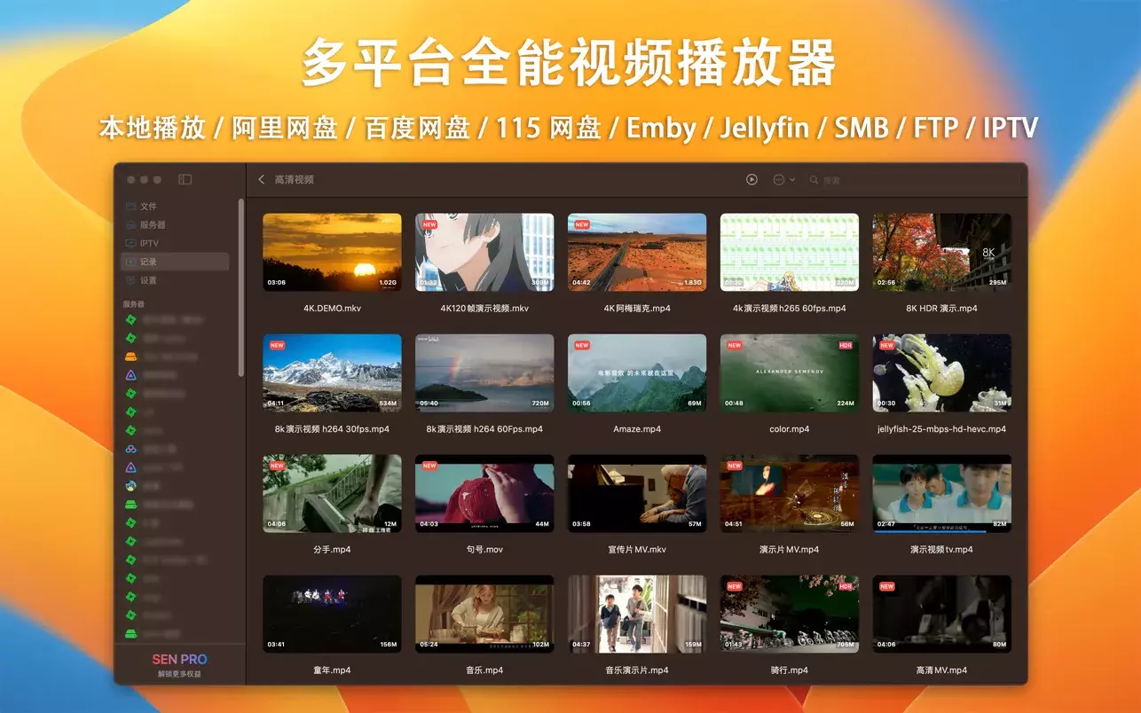 SenPlayer是一款功能强大的多平台视频播放器,支持8K解码、蓝光ISO原盘以及各种音视频格式,具备卓越的解码能力。它不仅支持Emby、Jellyfin及多个网盘(如阿里网盘、百度网盘和115网盘),还可通过WEBDAV、SMB、FTP和IPTV进行电视直播。用户可以享受iCloud同步观影记录的便利,实现多端播放的无缝体验。此外,SenPlayer完美支持HDR10和HLG,确保在苹果设备上呈现出色的HDR效果,兼容iPhone、iPad、Apple TV和Mac等多种设备。应用还提供文件管理、视频记录、私密空间和安全锁定等多项实用功能,确保用户的观看体验既便捷又安全。