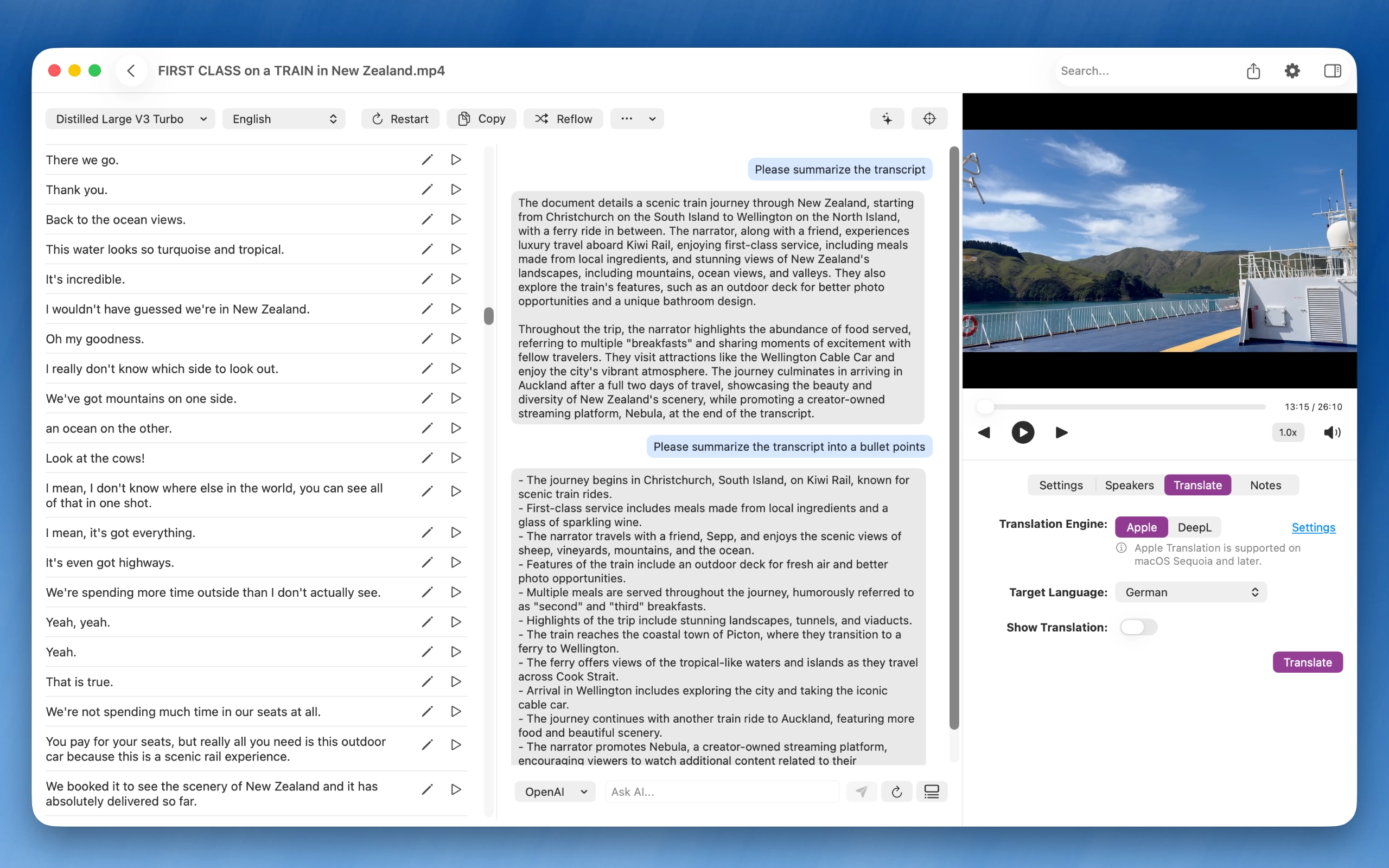 - AI 智能辅助:Pro 版支持使用 ChatGPT、Gemini 或 Ollama 总结转录内容、与转录文本聊天,并提供预定义 AI 提示加速工作流。