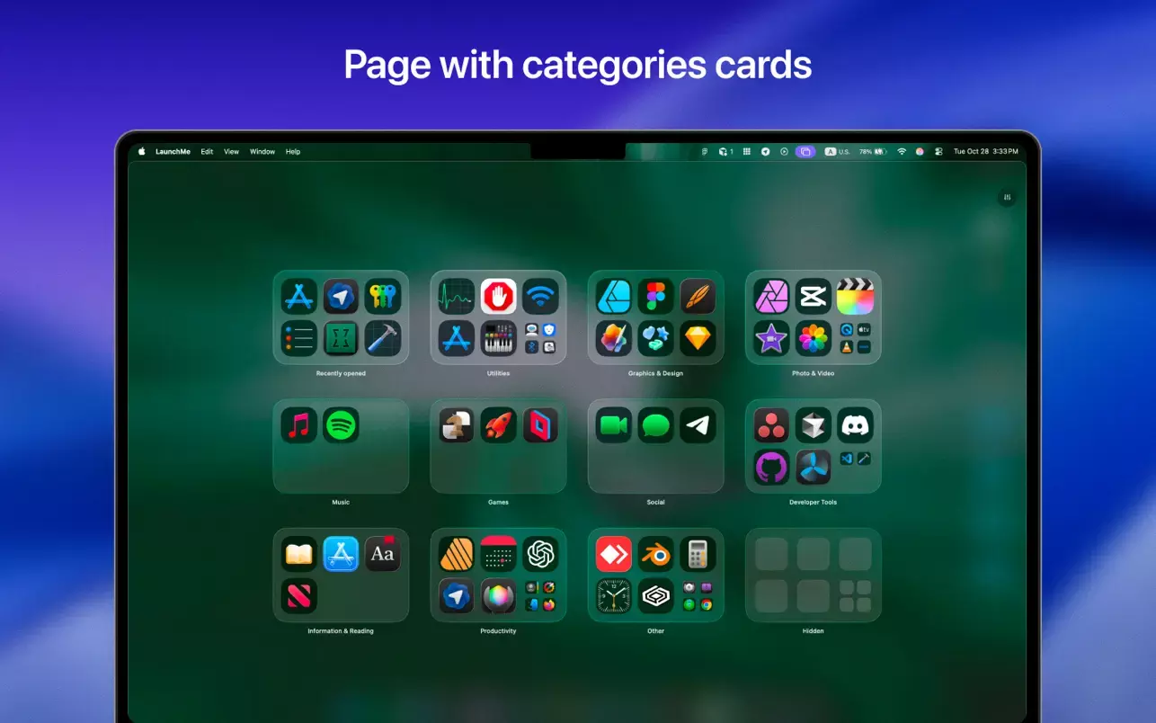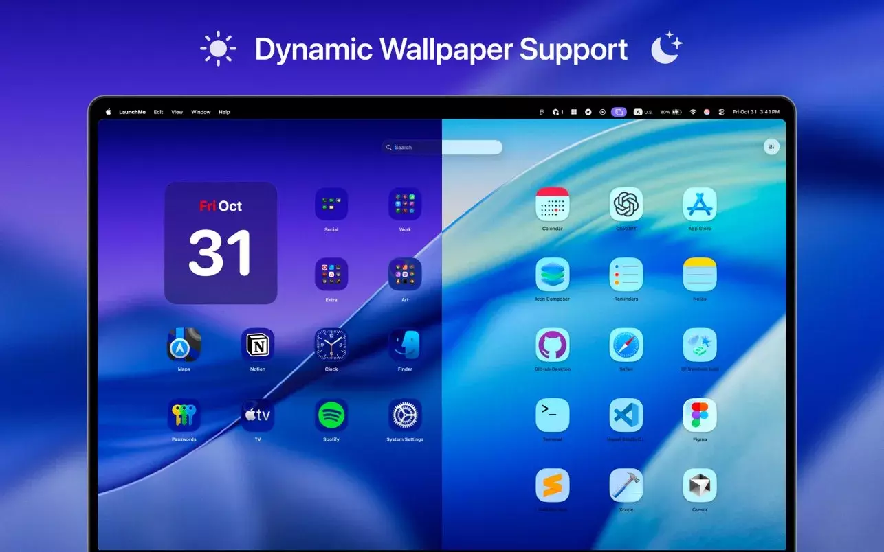 LaunchMe是一款强大且美观的应用启动器,提供丰富的自定义功能,旨在提升用户的应用管理体验。其主要特点包括小部件支持、分类页面、自定义布局以及主题切换(玻璃/平面)的功能。用户可以设置自定义背景,支持明暗主题,并能够快速导航到计算机上的任何文件夹,便于管理和访问。LaunchMe允许用户隐藏应用标题、调整图标大小、设置自定义快捷键和隐藏不需要的应用,甚至可以选择打开或关闭模糊效果来适应自定义壁纸。基础版本免费使用,但专业版则提供更多功能,如动态和视频壁纸、自定义文件夹的颜色与图标,以及其他更细致的自定义选项,值得注意的是,macOS 26 Tahoe中移除了Launchpad,因此LaunchMe将成为管理和自定义Mac应用的理想工具。该应用专为macOS 26及以上版本设计。