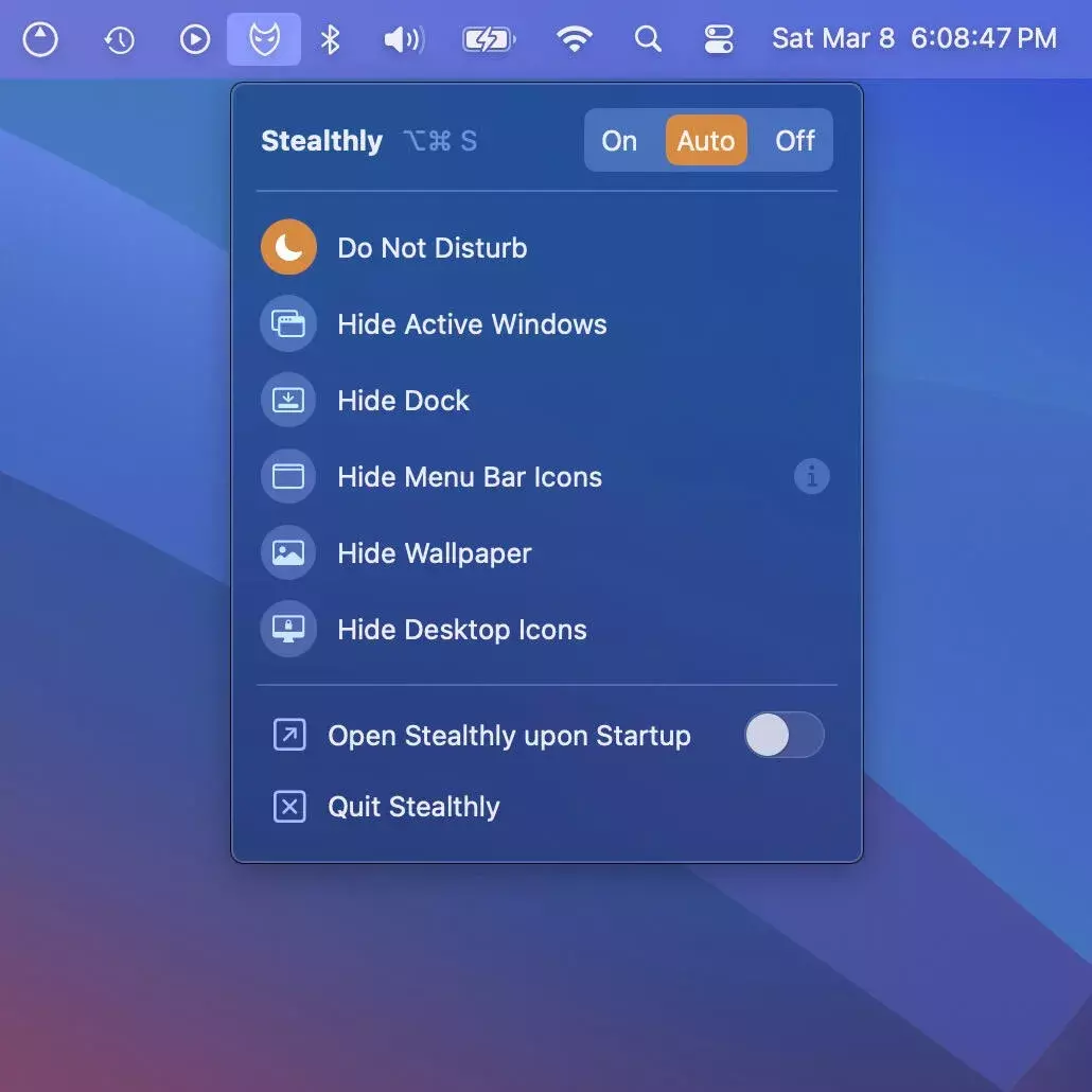 Stealthly 是一款专为 macOS 设计的自动化屏幕隐私保护工具,能够在屏幕共享或录屏时自动隐藏桌面图标、壁纸、Dock、菜单栏图标、活跃应用窗口,并启用“请勿打扰”模式,帮助用户保持屏幕整洁、专业且无干扰,专注于演示或工作。