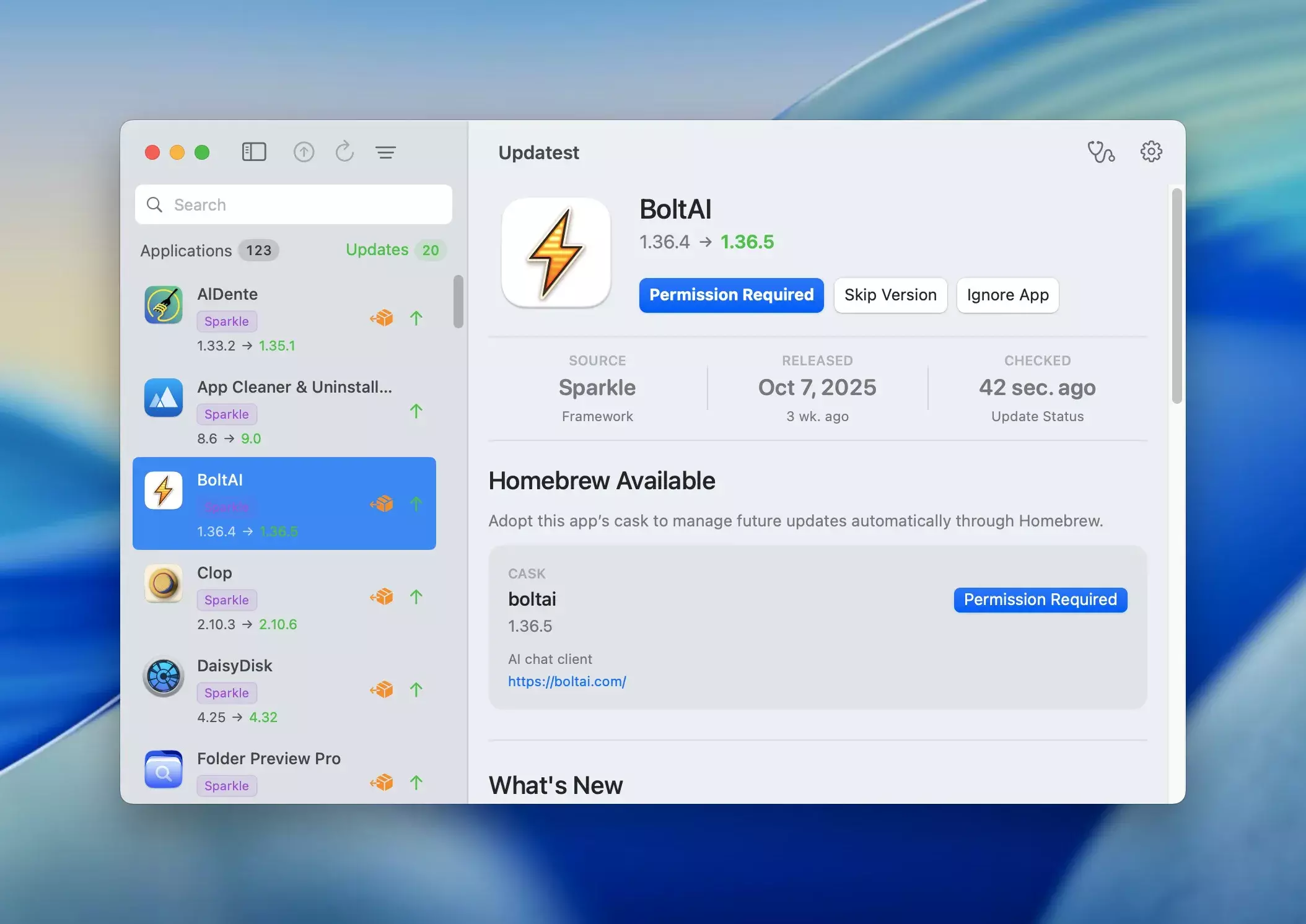 - 统一更新管理: Updatest 将 Mac App Store、Homebrew 和 Sparkle 的更新整合到一个界面中,方便用户轻松查看和管理所有应用的更新。