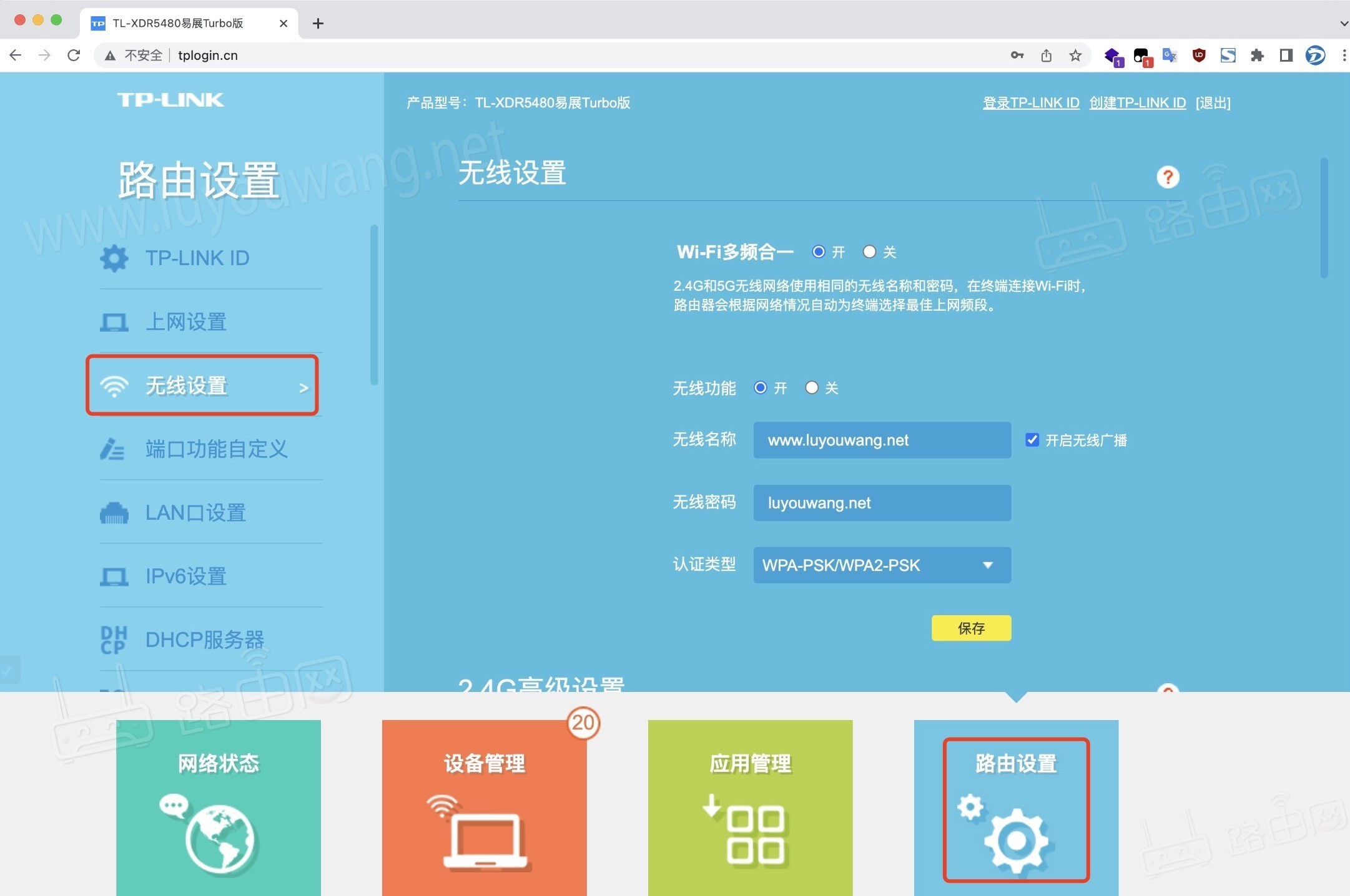 5、成功进入到路由器管理后台界面后,就可以对路由器进入管理设置了,比如经常使用到的修改WiFi信号名称或者修改WiFi密码,那么点击「路由设置」然后点击「无线设置」即可修改。