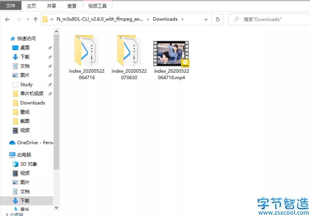 4.下载完后该窗口自动关闭,然后在该软件旁边打开相应文件夹 Downloads 找到合成后的视频(你需要的),视频旁边文件夹为合成前视频,删除即可