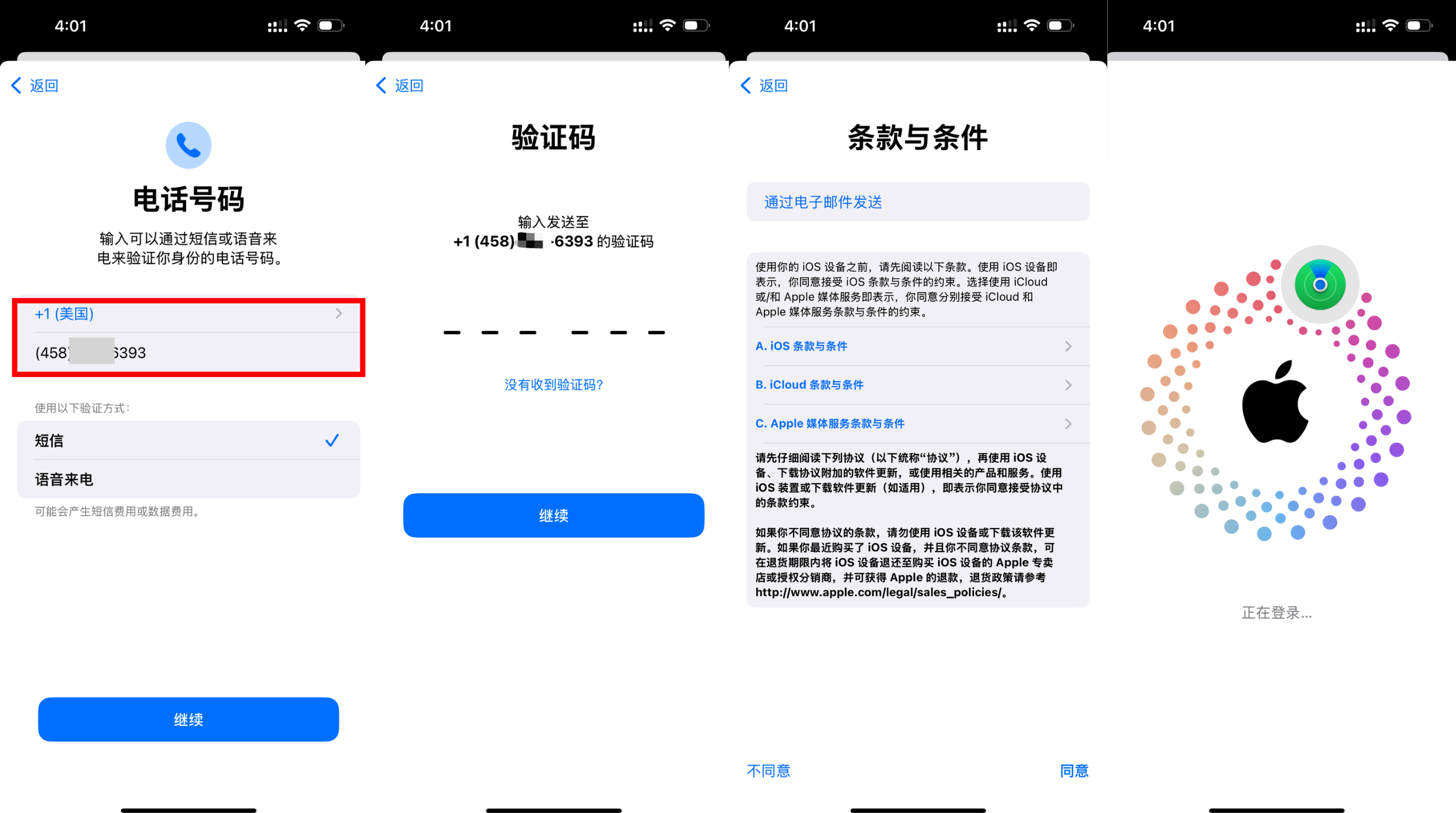 我这里呢就是使用我的Tello的美国手机号轻松一遍注册成功,填写手机号之后呢,输入手机收到的验证码,然后点击继续,然后同意条款,就会跳转到这个页面,这个界面需要耐心多等待一会,可能会比较久,途中会提示让你输入iPhone的开机密码。