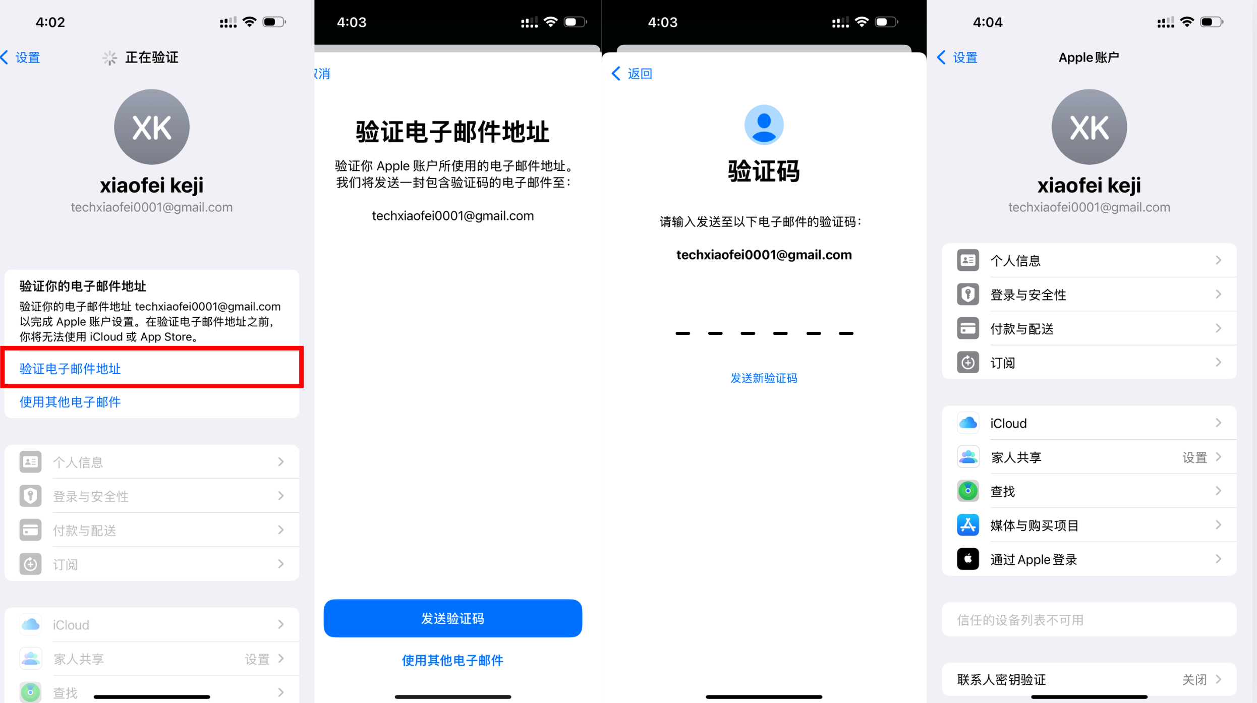 我稍等了一分钟左右,才跳转到下一个界面,当你看到这个界面就注册成功了,注册成功之后还还需要验证电子邮箱,点击「验证电子邮件地址」,跳转到该界面,点击「发送验证码」,在该界面输入邮箱验证码,稍微等待一下,等它验证完成,美区Apple ID的注册流程基本上算是完成了。