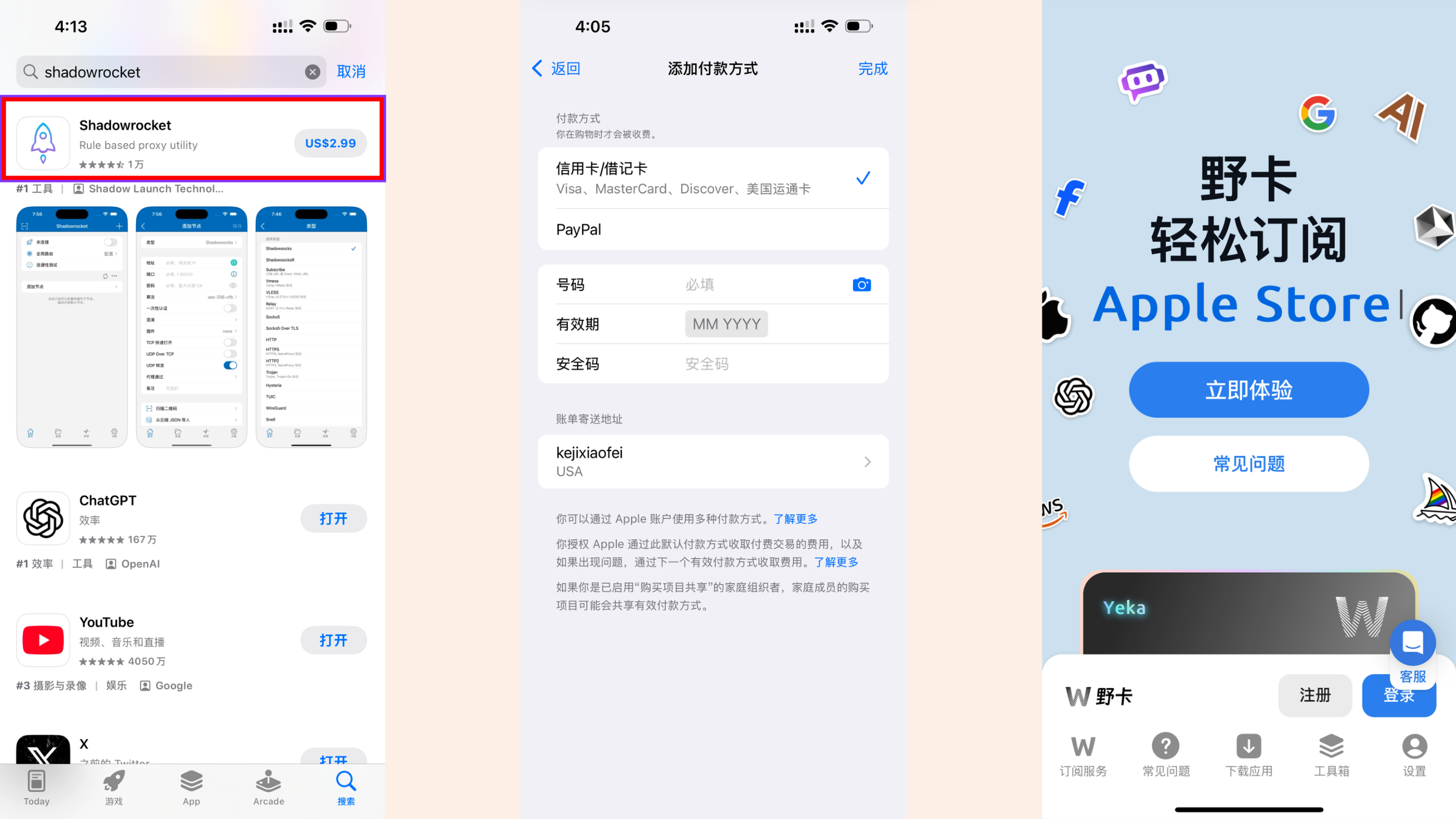 如果你想要下载付费App该怎么办呢?比如你要购买Shadowrocket,这个苹果手机最经典的翻墙工具,它呢需要2.99美金,我们下载之前需要先在设置里面添加付款方式,付款方式呢支持信用卡/借记卡和Paypal,这里说明一下,这两种付款方式只支持美国卡和美国区的Paypal,如果你的卡不是美国区的是添加不成功的,比如你是澳区的Bybit卡,我也替大家试了,无法添加的。你没有美国区的卡怎么办呢?
