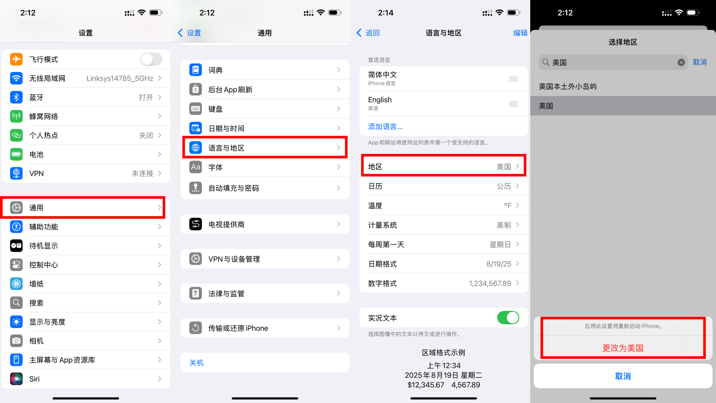 在此之前呢,我们需要把手机系统设置里面的国家或地区改成美国才能保证美区的Apple账户创建成功。当然了,注册成功之后呢,我们可以再回到设置里面改回中国大陆就行了。我们在设置里点击「通用」,点击「语言与地区」,点击地区这里,如果不是「美国」的话我门需要选择美国然后点击「更改为美国」。这样就可以了。
