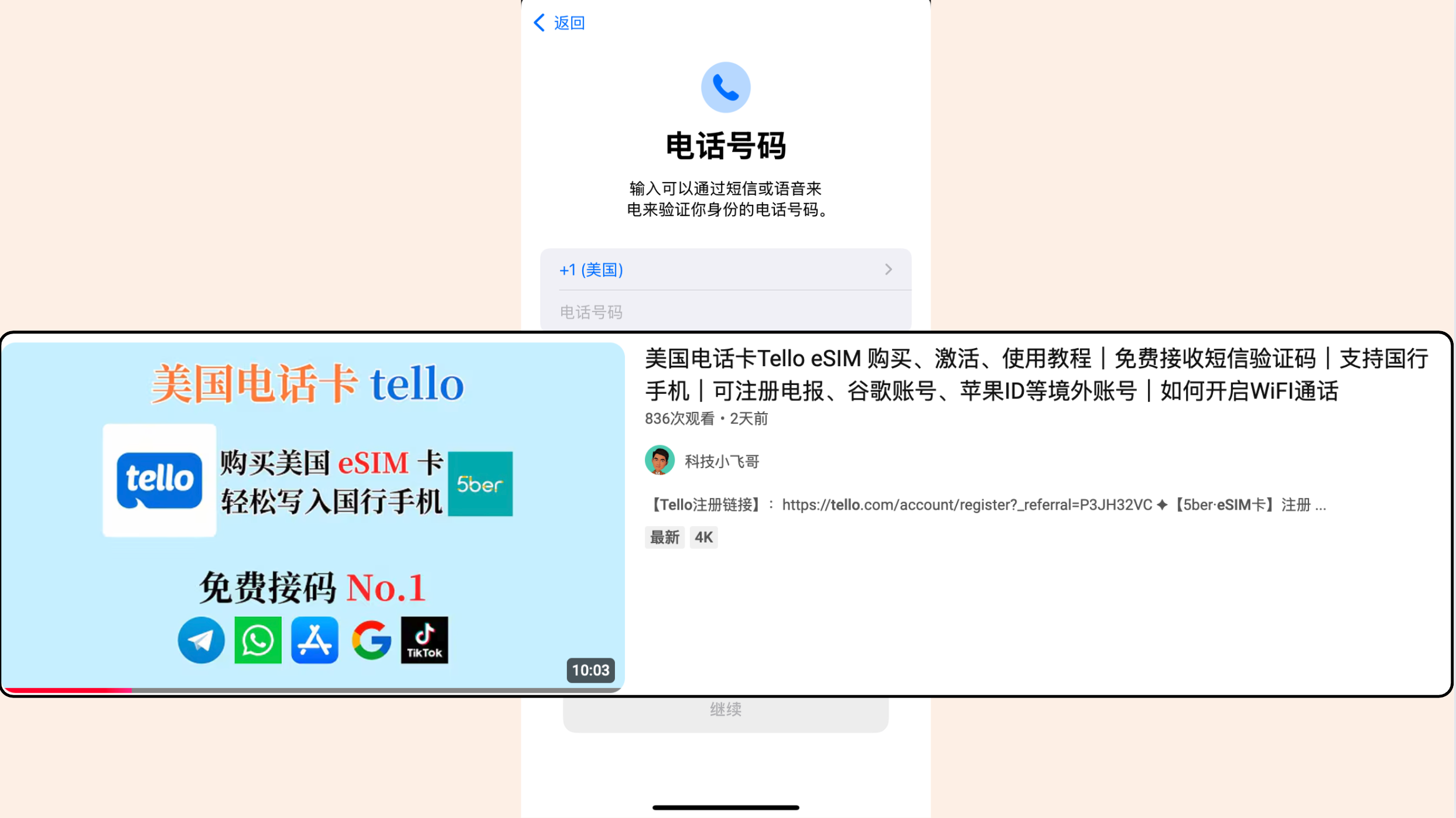 接下来输入手机号码,这里呢,首选是美国电话号码,因为注册的是美国Apple账户,所以用美国电话号码成功率是最高的。当然了它也是支持内地和香港的手机号码的,这里+86的手机号码是可以的,前提是这个手机号不能注册过苹果账号,如果呢+86和+852香港手机号码都不可以,比如弹出目前无法完成你的请求,那就是你的手机号有问题,那就需要用美国的手机号码,办一个美国的手机号码也非常简单 可以参考我之前的这期视频,可以轻松购买美国Tello eSIM电话卡并写入到国行手机,这个Tello的eSIM真的是一个免费接码的神卡,可以注册基本上所有的境外平台账户。链接我也放在了视频下方。