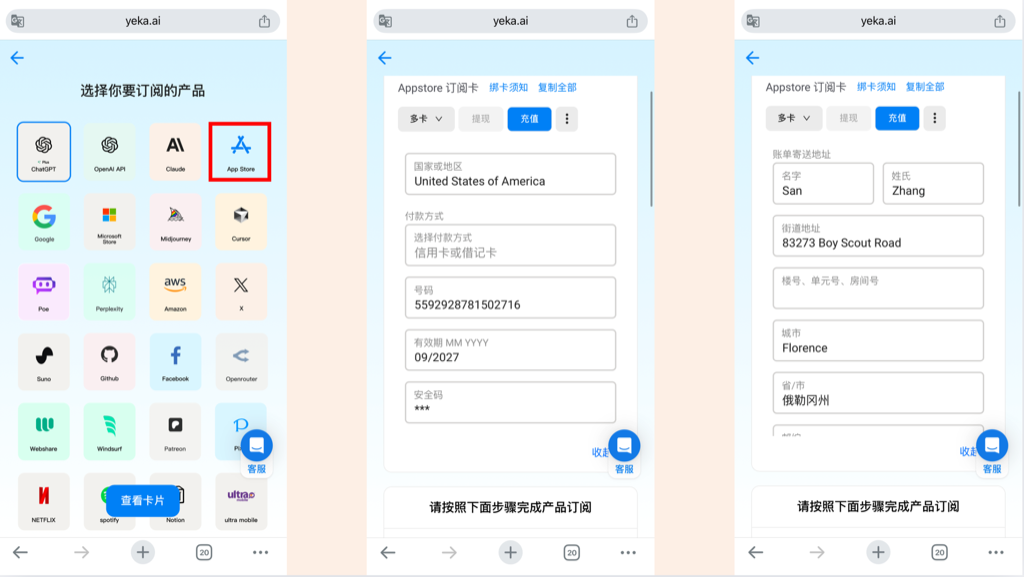 我们可以看它支持ChatGPT、苹果应用商店,Google,微软商店,奈飞等众多海外知名平台。而且最牛的是什么呢,它可以根据你订阅的产品给你提供不同的填写格式,比如我们选择App Store,他就会提供App store 需要我们填写的这些信息,比如卡的信息,然后就是账单寄送地址,所有需要填写的信息都按照App store的格式给你准备好了,超级方便,其它产品也是一样的,野卡给你提供好了各个平台所需的信息格式。