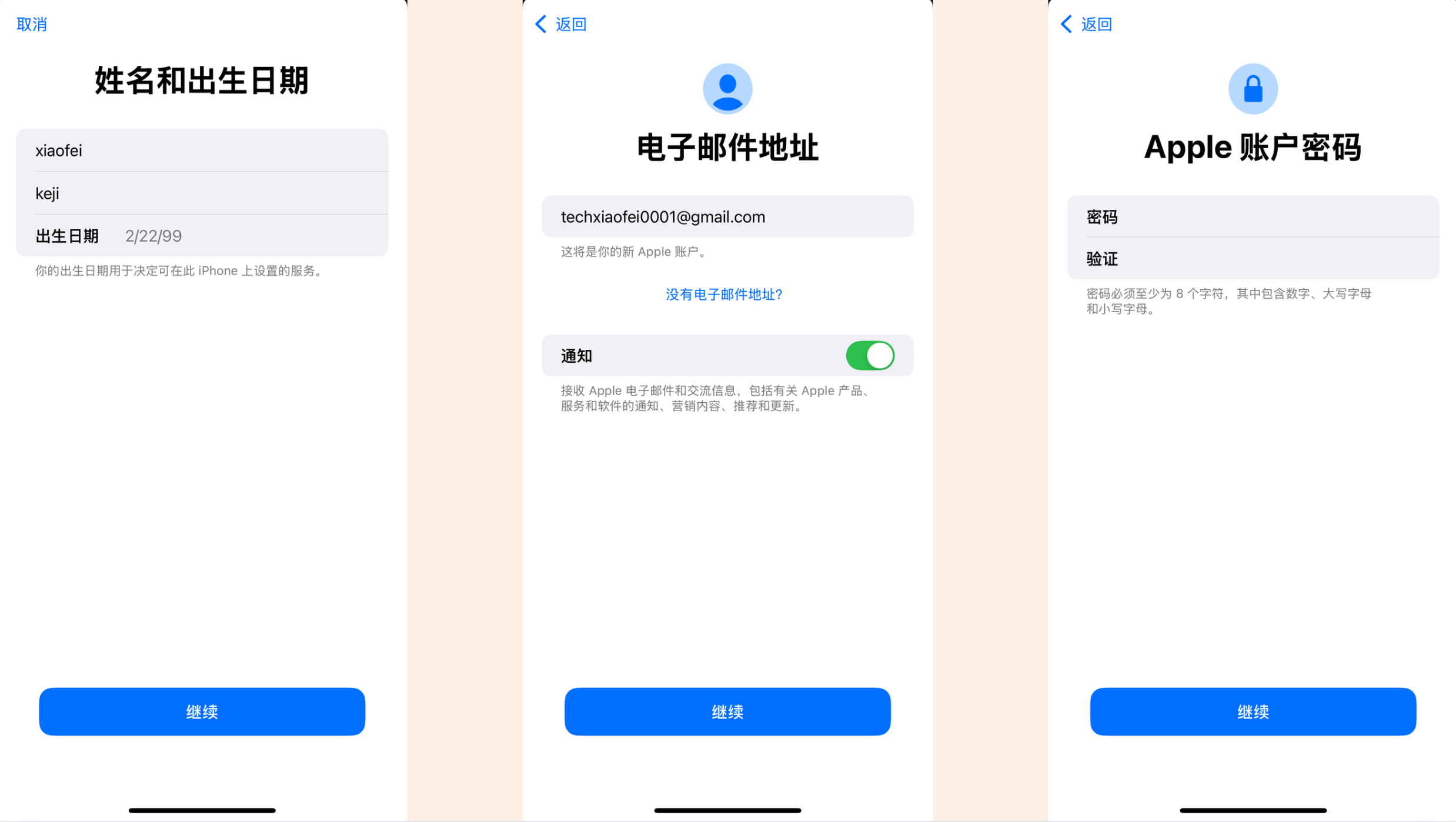 然后下一页呢输入你的姓名和出生日期,姓名可以用拼音填写或中文填写,要保证这个出生日期大于18岁才能享受苹果账户的全部功能,填写好之后 点击「继续」,在这里填写电子邮箱地址,要求是该邮箱之前没有注册过Apple ID,建议用Outlook、Gmail等境外邮箱,当然也可以用QQ,163等邮箱,填写好邮箱之后,点击「继续」,在该界面设置Apple账户的密码,填两遍,点击「继续」。