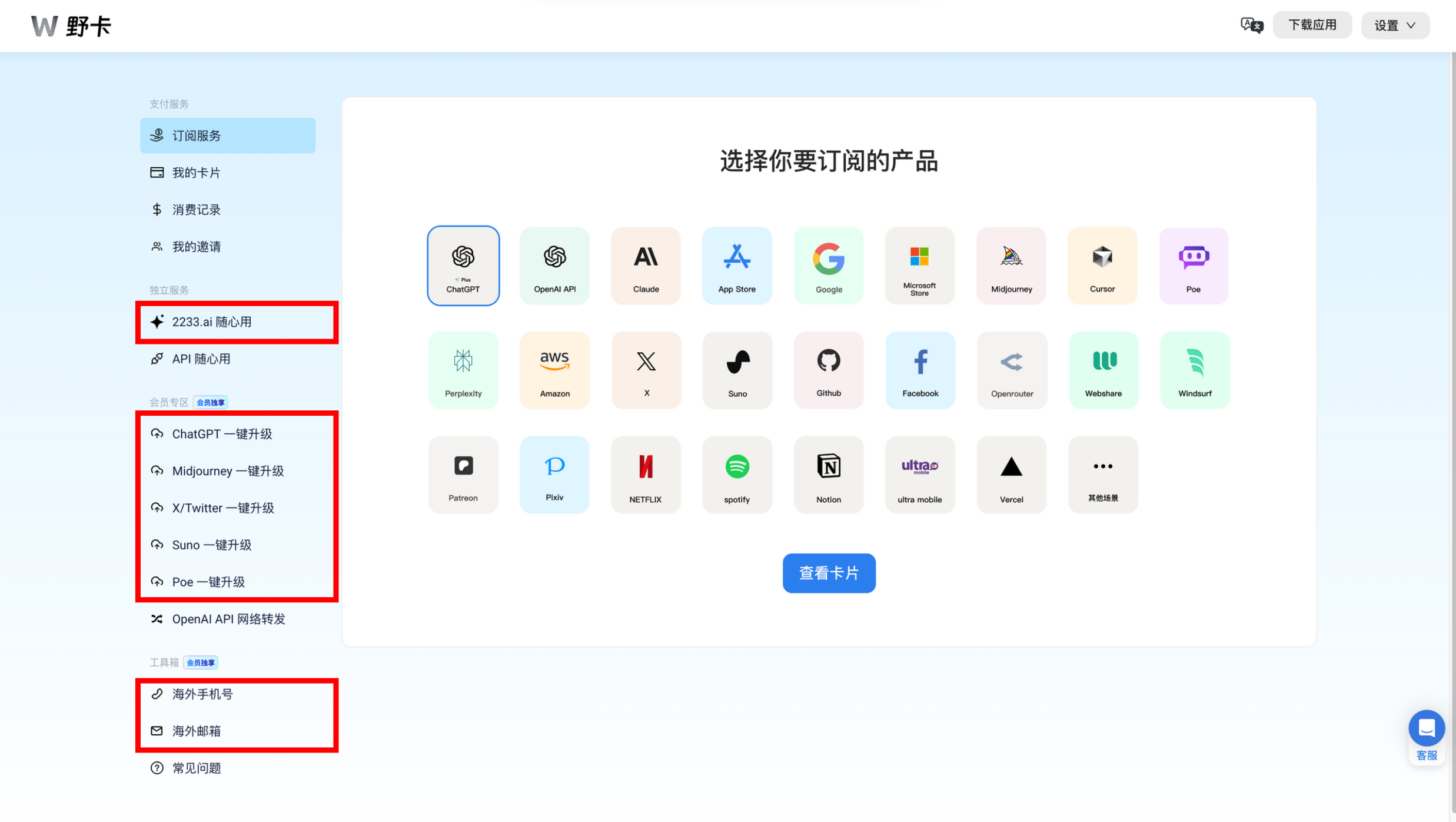当然了野卡还有很多其它强大的功能,比如AI随心用,内置各大平台AI,无需账号且无网络要求,还可以一键升级AI产品,无需你手动填写信用卡信息,还有海外手机号,海外邮箱等,WildCard野卡就是我用过最强大的虚拟卡,支付宝就可以充值,有需要的话大家点击我视频下方的链接注册,可以减免开卡手续费。