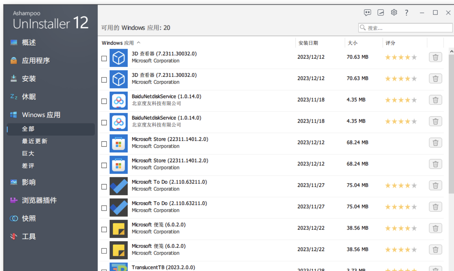 Ashampoo UnInstaller是一个监视和卸载Windows应用程序的工具。用户可以非常方便地在软件中查看他们所有的应用程序,并支持可以从他们的电脑上卸载的应用程序。Windows应用程序在今天非常复杂,其中一些包含大量文件,并存储在不同的位置。此时,用户可以使用aberasop卸载程序来清理这些不必要的文件,并使计算机系统更干净。该软件非常强大和紧凑,允许用户监控和清洁计算机程序,安装记录,互联网历史和缓存,Cookie,临时文件,字体,复制文件和注册表格和更多。