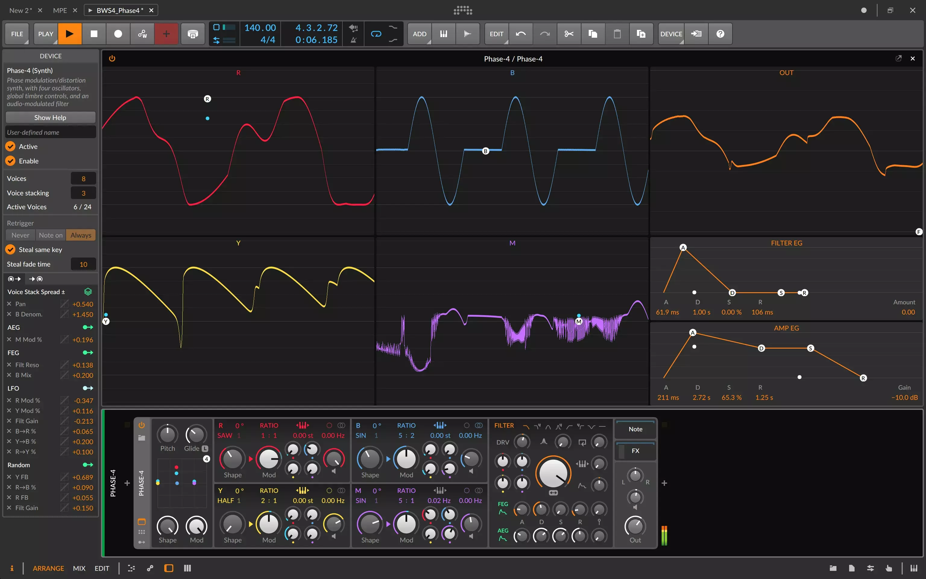 - Phase-4是一个四振荡器合成器,通过相位调制和相位失真提供动力。
