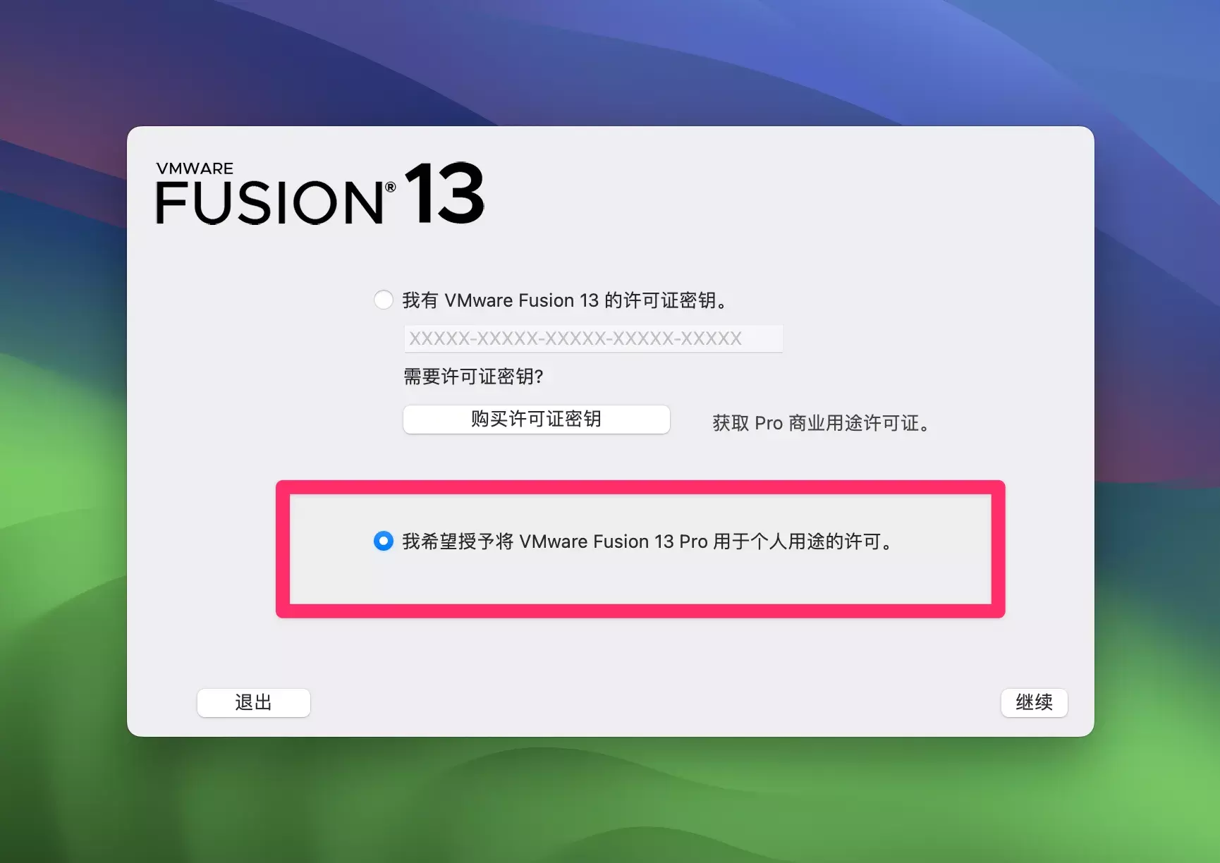 安装完成后选择我希望授予将 VMware Fusion 13 Pro 用于个人用途的许可无需输入key即可使用