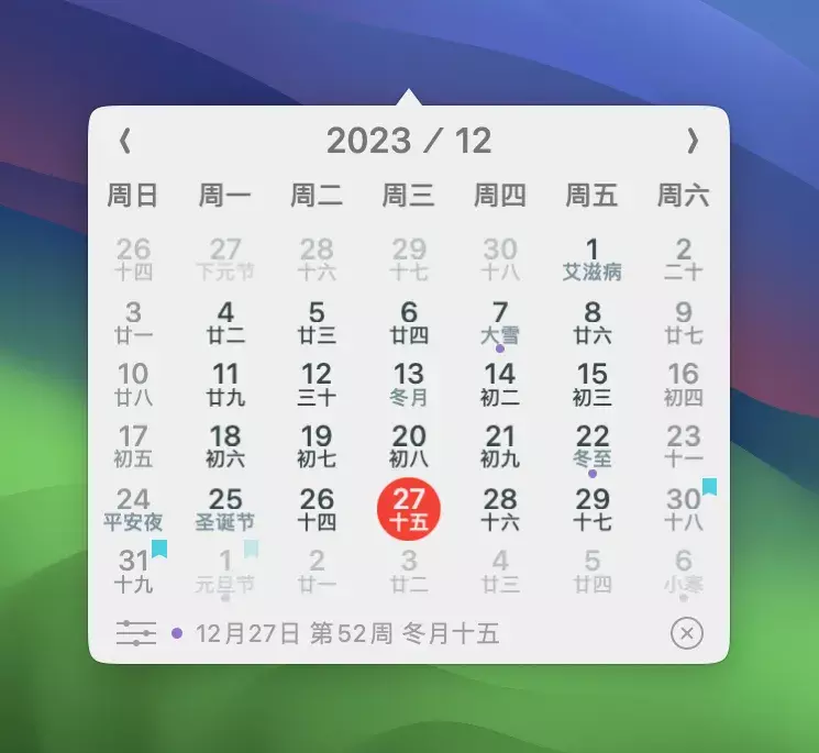 - 显示农历、节日节气和法定节假日
