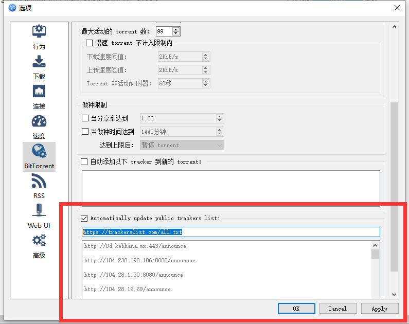 - 自动更新公共跟踪器列表(默认:关闭)