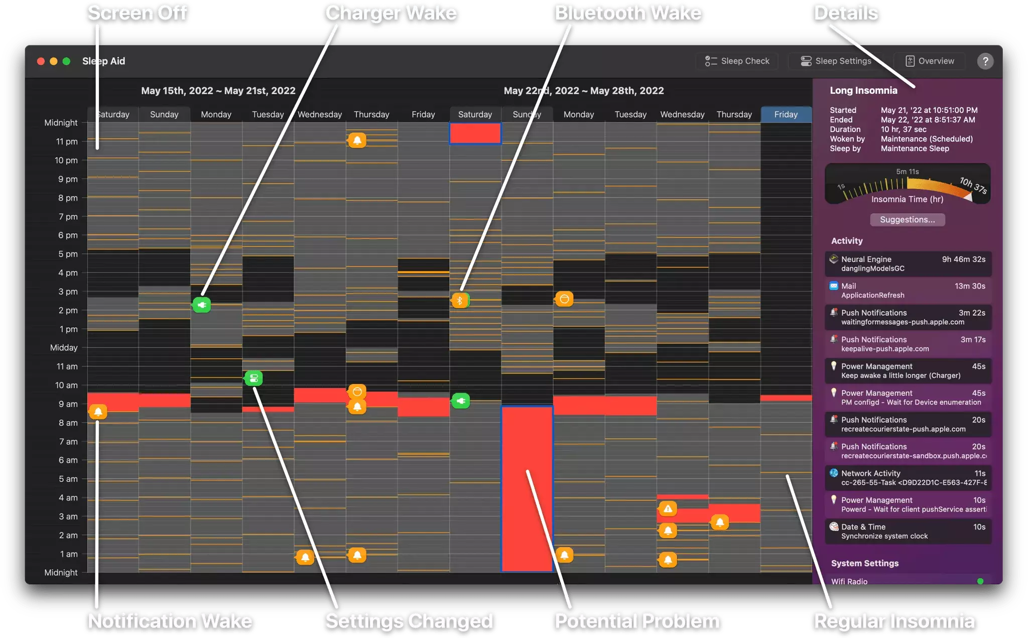 - 可视化睡眠习惯: Sleep Aid 提供睡眠历史查看器,可以清晰显示 Mac 的睡眠模式,包括未睡眠时段、伪睡眠状态、阻止睡眠的应用等信息。
