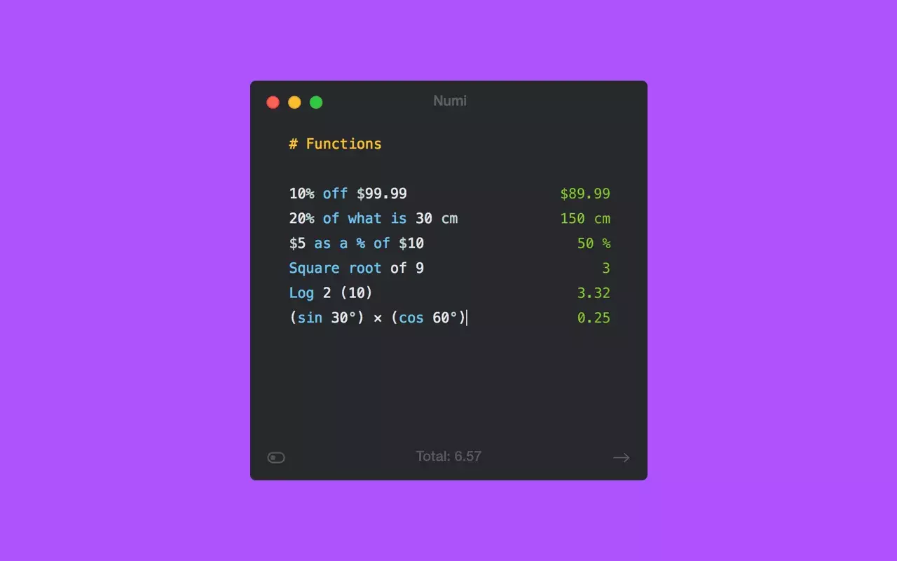 Numi支持多种计算类型,包括基本数学运算、单位转换、时间计算、百分比计算等等。它还具有自动括号匹配、即时结果显示、自定义变量和函数等高级功能。此外,Numi还支持快捷键和自定义主题,方便用户个性化设置和操作。Numi是一款非常方便实用的计算工具,特别适合需要频繁进行计算的人群,例如学生、教师、工程师、金融从业者等。