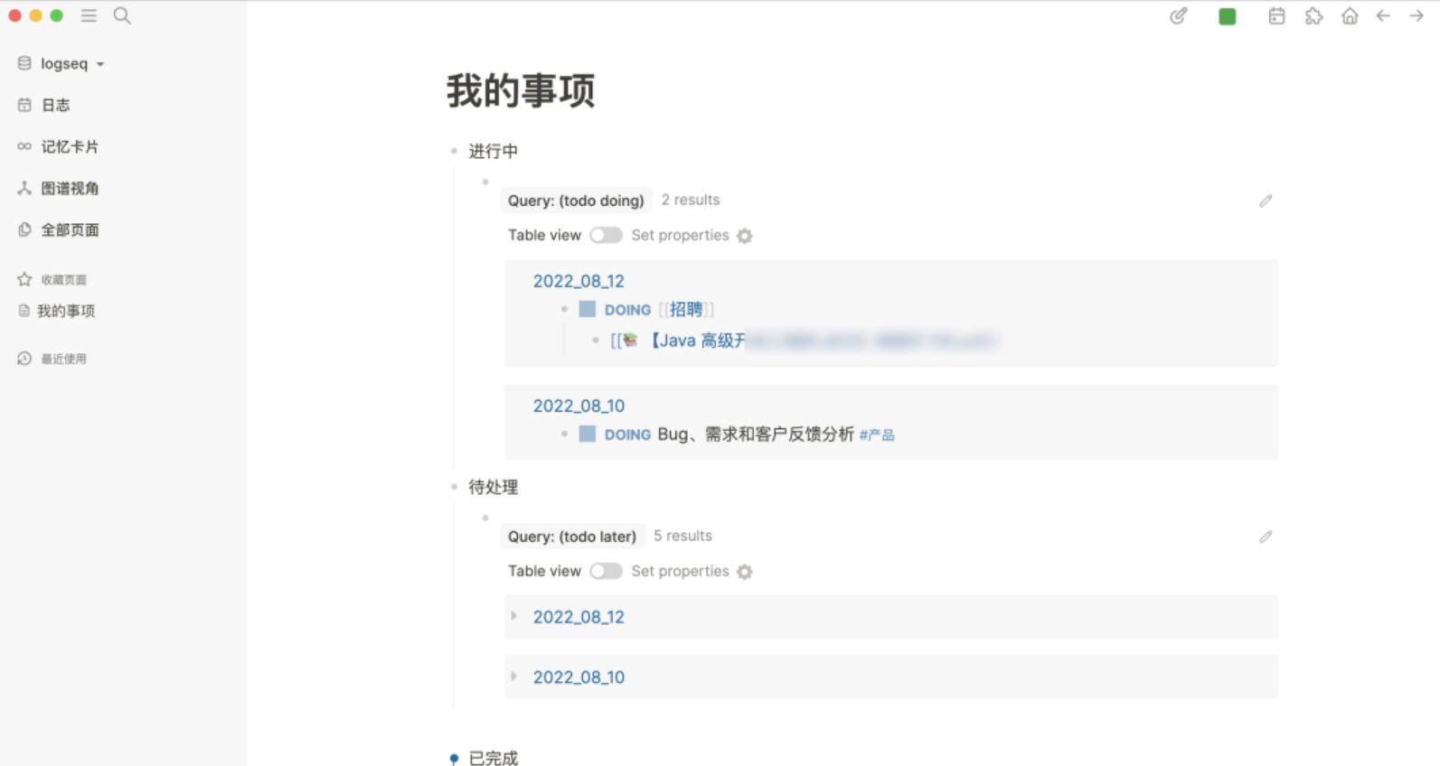 使用内置的工作流命令(如现在/稍后/完成、A/B/C 优先级和重复的计划/截止日期)组织您的任务和项目。此外,logseq还配备了强大的查询系统,可帮助您获得见解并构建自己的工作流程。