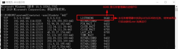 解锁443端口方法,管理员身份运行cmd,键入 :netstat -aon|findstr “443”。