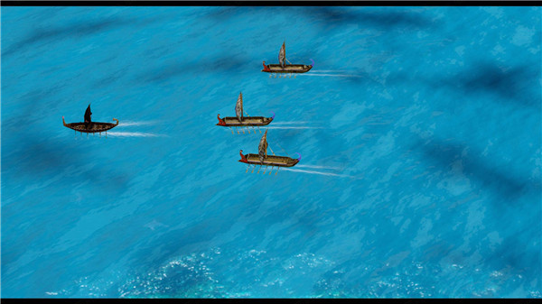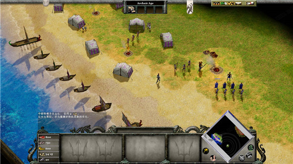 注意点:在岛屿的正上方有一艘沉船,发现它可以获得1000资源。另外升级到古典时代后请建一个码头,制造少量的运输船提高运输速度(到敌人阵地),制造战船提高攻击力量